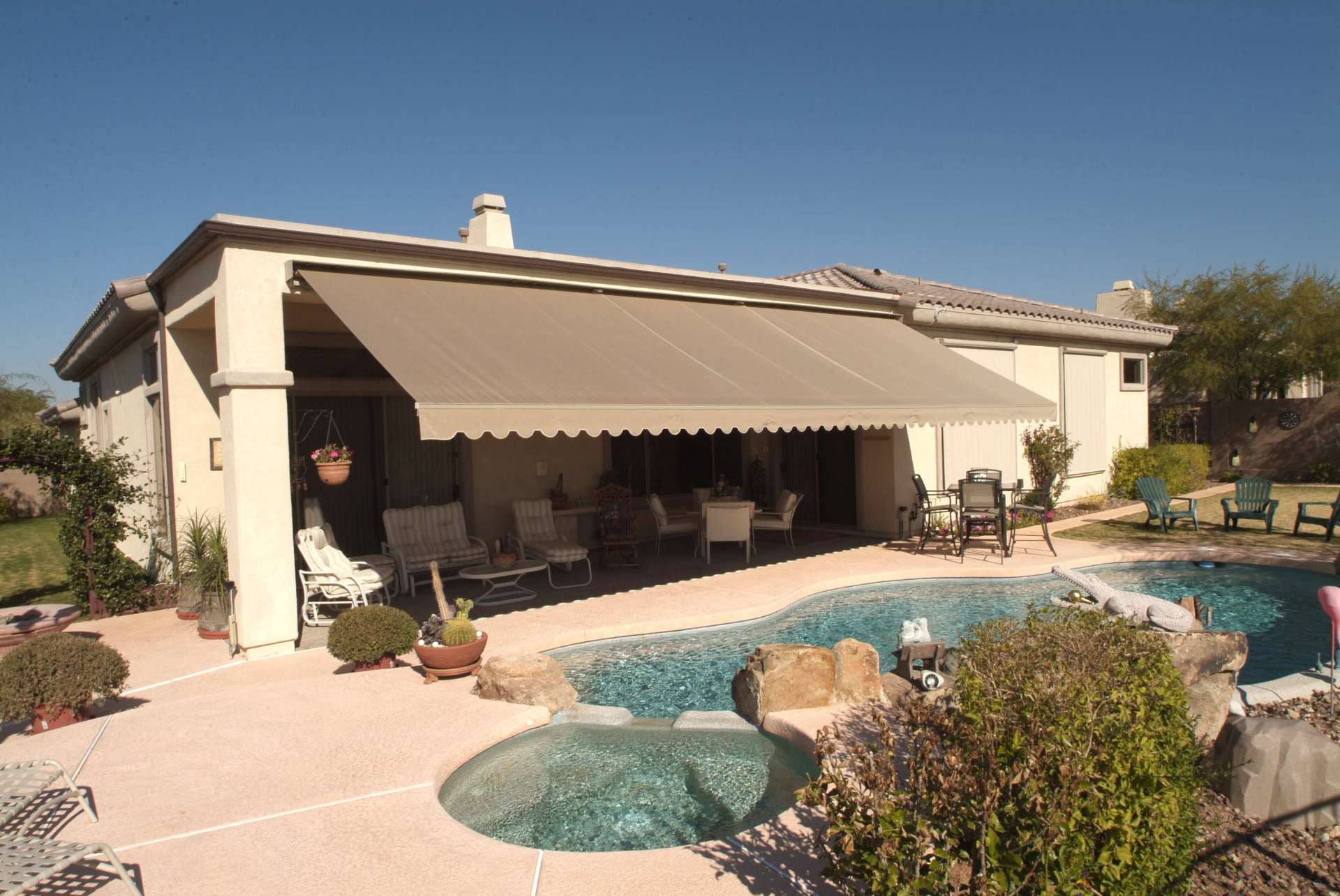 Retractable awnings provide shade and comfort during outdoor parties, pool days and family gatherings. They allow you to expand an outside patio by hundreds of square feet to protect you, your guests and your outdoor furniture from the harsh sun, heat and rain. Retractable awnings provide shade when you want it, while still giving you the option to enjoy the open sky on those beautiful days.